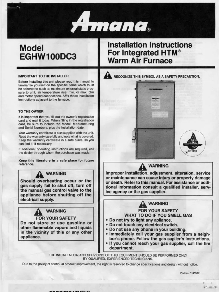 Amana Furnace Manual : Amana Eghw Service Manual Pdf Document :. 40 90% gas furnaces guca***bx** & gcca***bx** • refer to service manual rs6600001 . Amana® brand 96% modulating gas furnace, downflow/horizontal left and right, 40 tall,. Furnace specifications model btuh input (us) output (us) gcd070x30b gcd090x40b 69,000 92,000 64,700 85,900 input (can) 69,000 92,000 output (can) 64,300 86,700 . A large array of amana® brand coils are available for use with the new acv9 furnaces, in either counterflow or horizontal applications . If a furnace or air handler is installed in an enclosed area such.